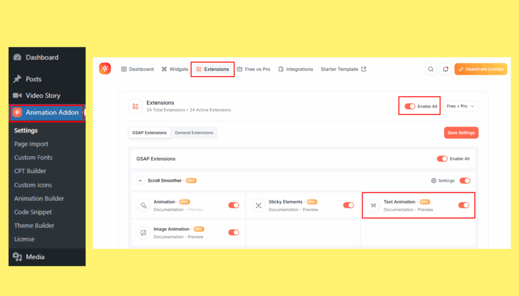 Step 2: Next, go to the Animation Addons plugin and click on Extensions. Choose any extension you want to use to add animation to your WordPress site.