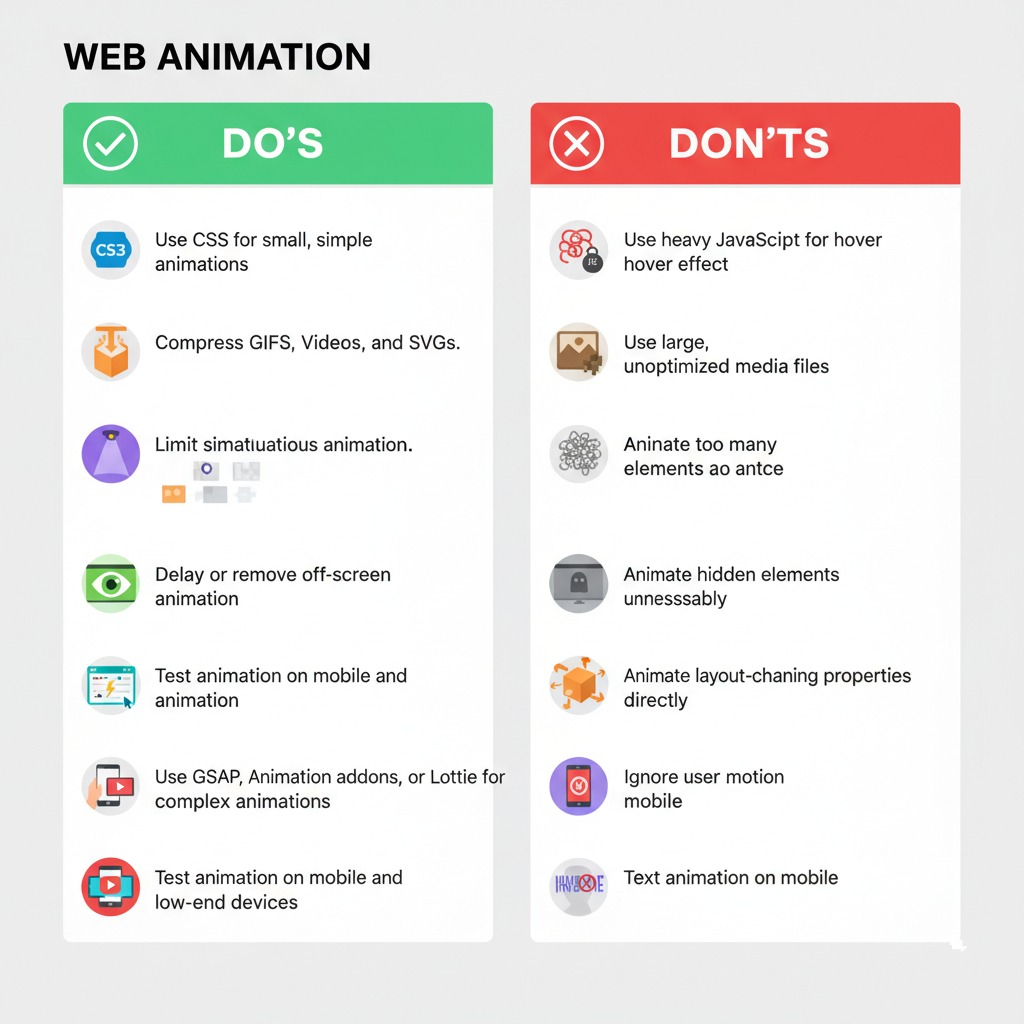Optimizing animations is not just about speed, it’s about creating smooth, engaging experiences without slowing down your site. Here are proven strategies to keep your animations light, efficient, and user-friendly: