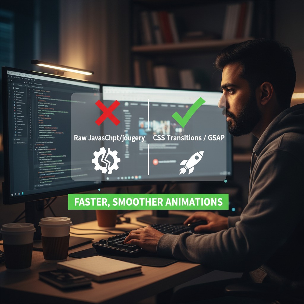 Not all animations need JavaScript. For small effects like fades or hover states, use CSS transitions because they are faster and more efficient. For advanced scroll or timeline-based effects, use GSAP (GreenSock Animation Platform), which is far smoother and better optimized than raw JavaScript or jQuery.