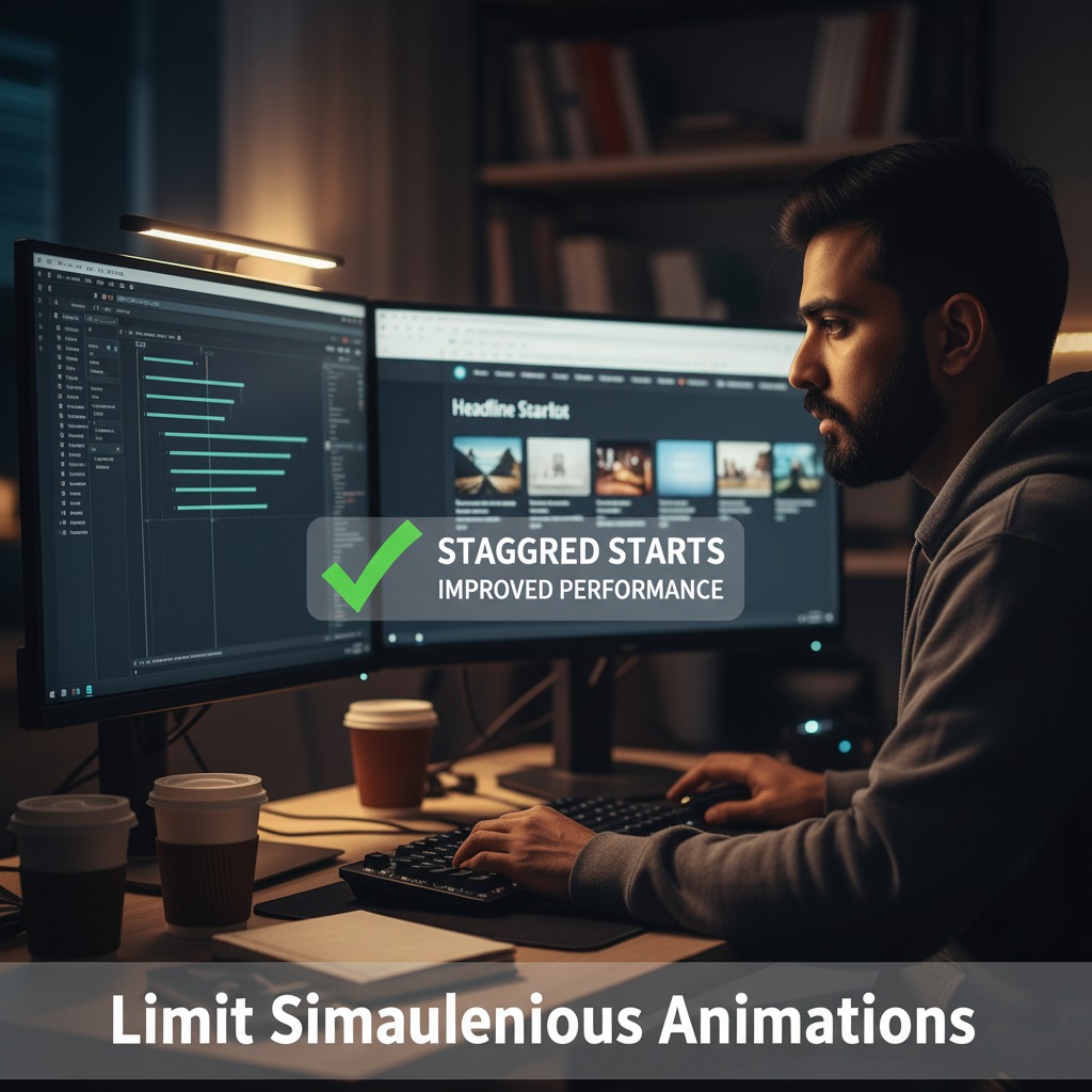 Running too many animations at once causes frame drops and poor performance. Keep only one major animation active at a time. If multiple elements need to move together, use staggered starts which begin each 0.2 seconds apart.