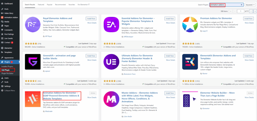 First of all, go to WP Admin dashboard → Plugins → Add Plugin. Now search for “Animation Addons” in the search bar. Install the plugin and activate it.