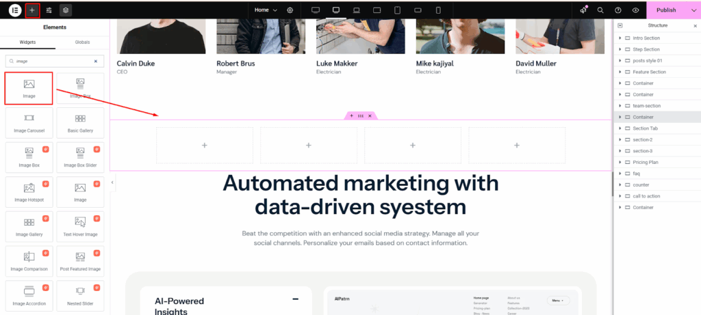 Then, click on the ‘+’ icon. You will find two layout options, Flexbox and Grid. Choose the Flexbox option. Now from the search option in the left panel, click on ‘Image’ and drag it to the container that you have selected.