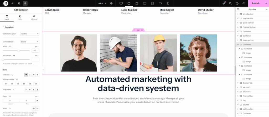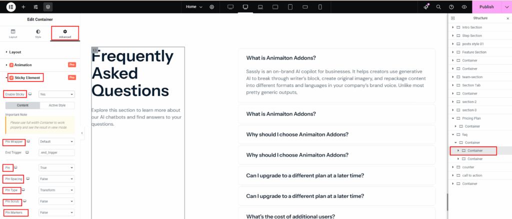 Select the element you want to make sticky and enable the wrapper by clicking on its container. Go to the Advanced tab, find Sticky Elements, and toggle it to Yes. After that, adjust settings like Pin Type, Scrub, and Spacing to control how the element stays pinned. Below we mentioned what are the features of Sticky elements and which option we choose –