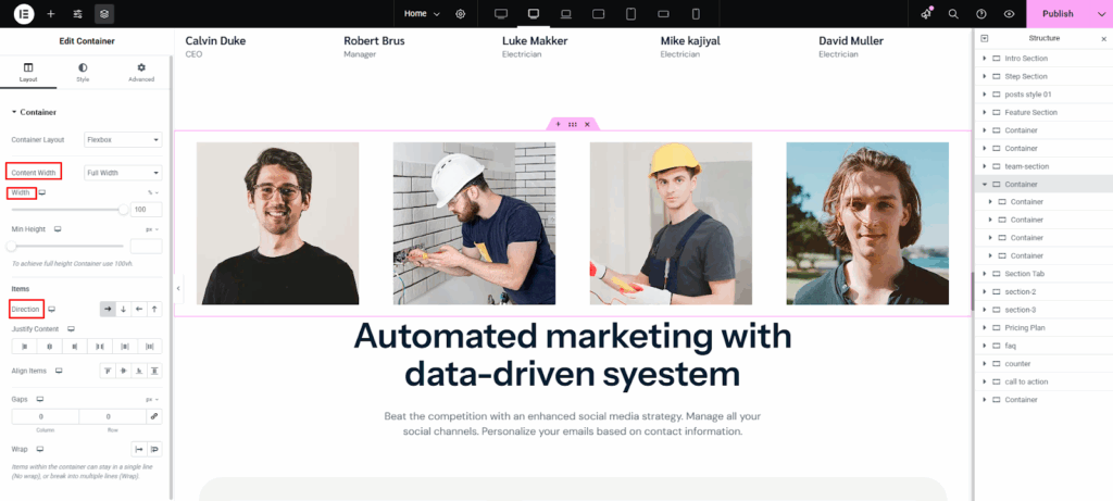 Set the content width to Full Width to ensure the horizontal animation scrolls smoothly. Then, adjust the width value (e.g., 100) based on your layout. Finally, choose your preferred direction, for instance, Row-horizontal moves the container to the left.