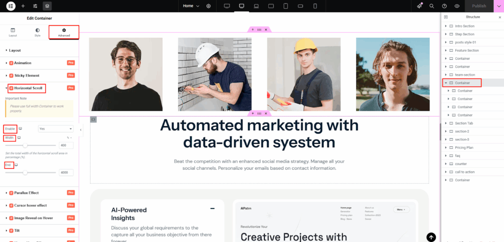 Go to the Advanced tab and enable the Horizontal Scroll option. Set the Width based on your container count (e.g., 400 for four containers). Adjust the End value to control when the scroll animation stops, for instance, 2000 ends after 2000 pixels of scrolling. In my case, I used 4000, but you can modify it based on your layout needs.